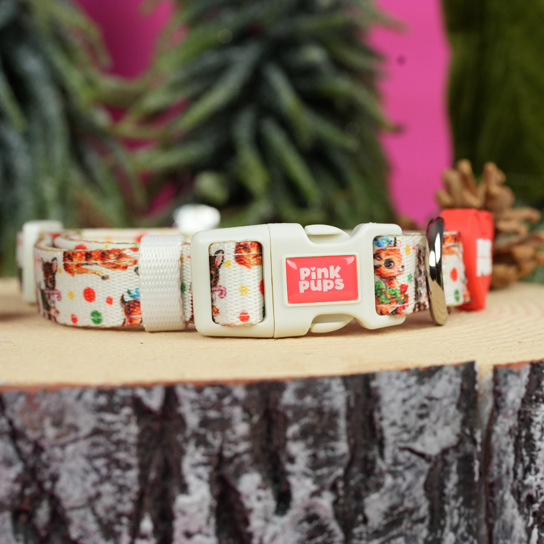 This fully adjustable dog collar combines comfort with festive style, featuring an adorable retro reindeer design on soft neoprene fabric in a cheerful cream hue.