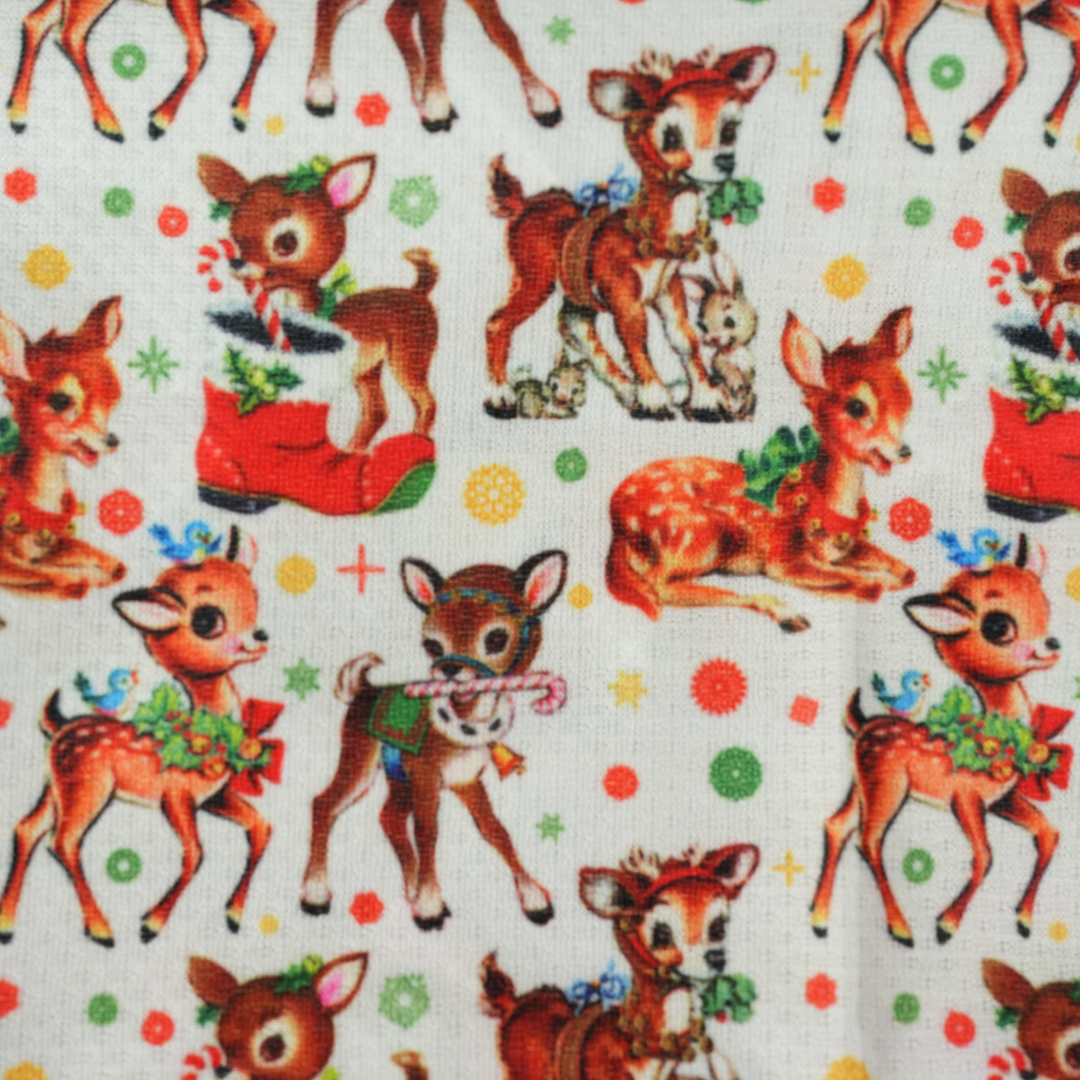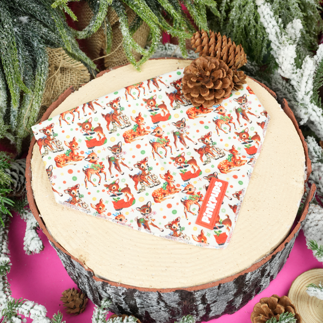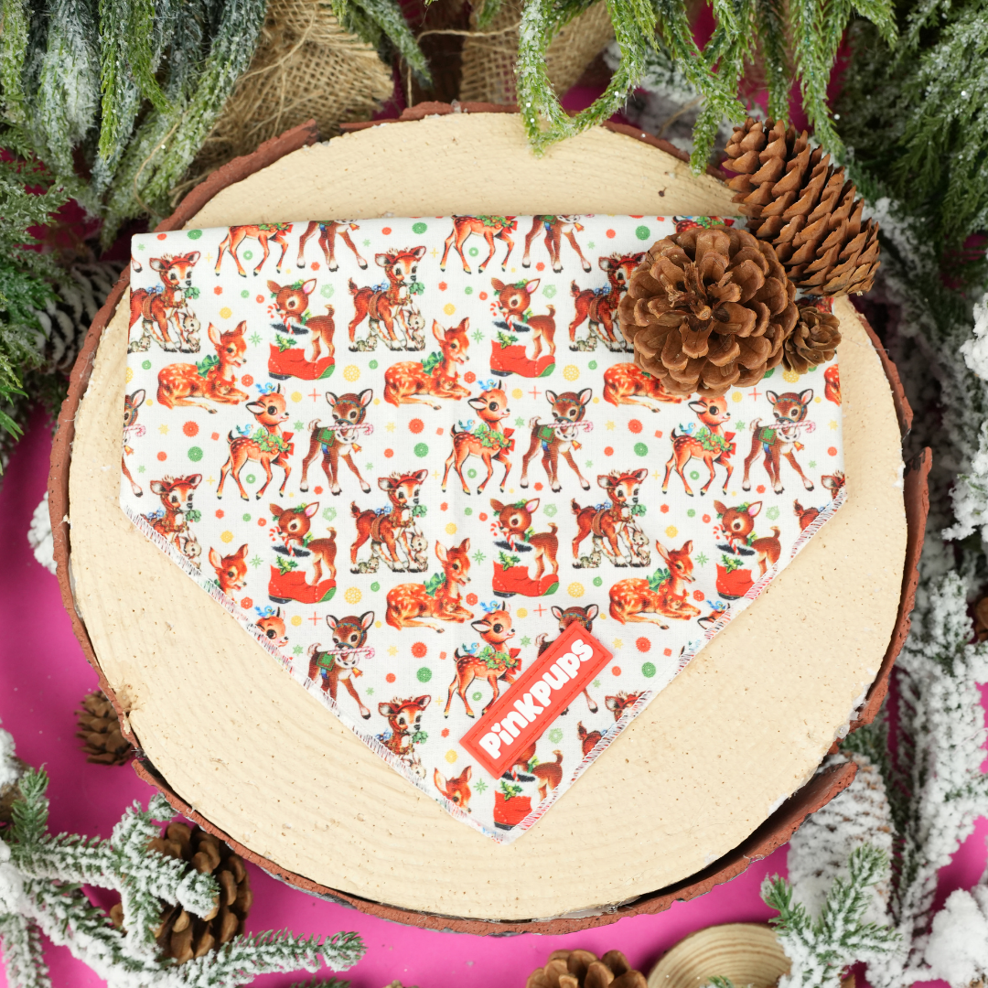 This adorable bandana features a fun retro reindeer print on a cream fabric, perfect for adding a cute festive touch to your dog’s holiday wardrobe.