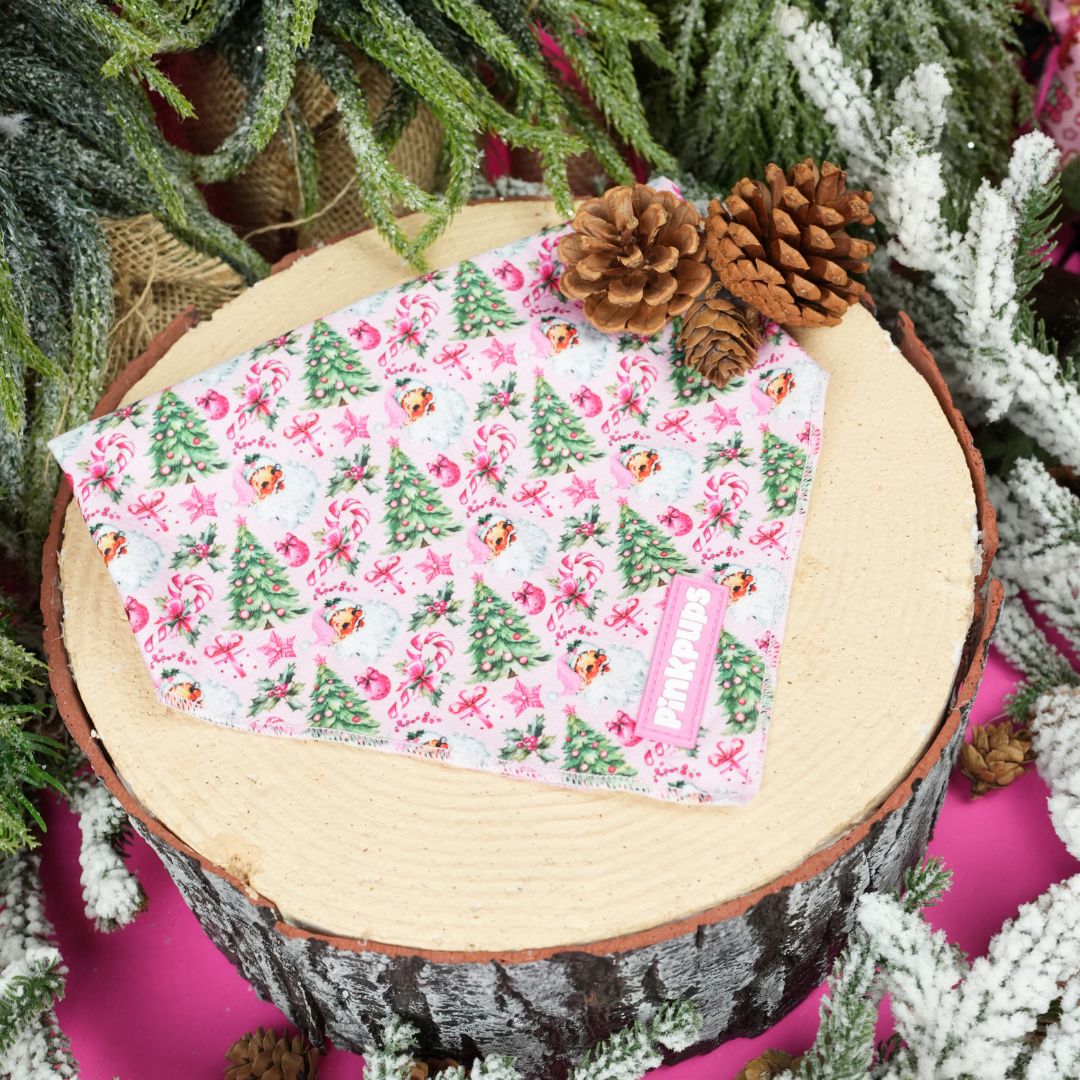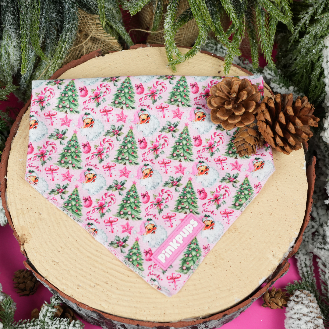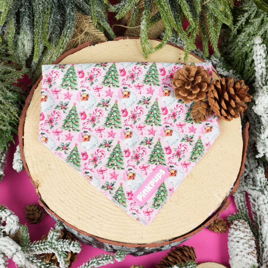 Featuring a playful retro Santa face on pretty pink fabric, this bandana is perfect for adding a cute festive touch to your pet’s holiday outfit.